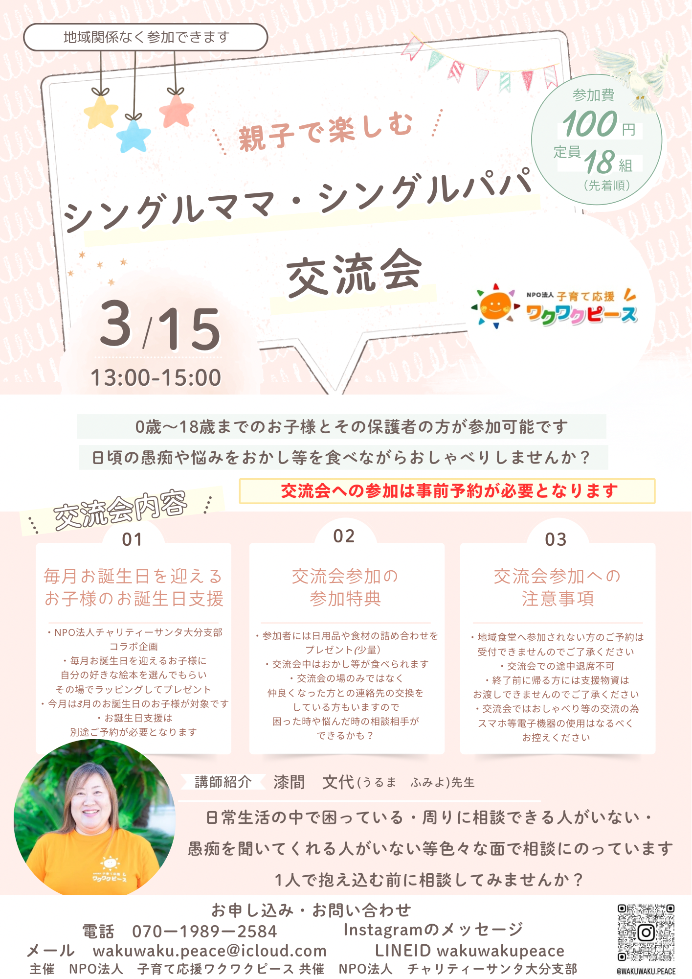 毎月第3日曜日(変更あり)に開催している地域食堂ワクワクピースでは、ひとり親(シンママ・シンパパ)交流会を開催しています。