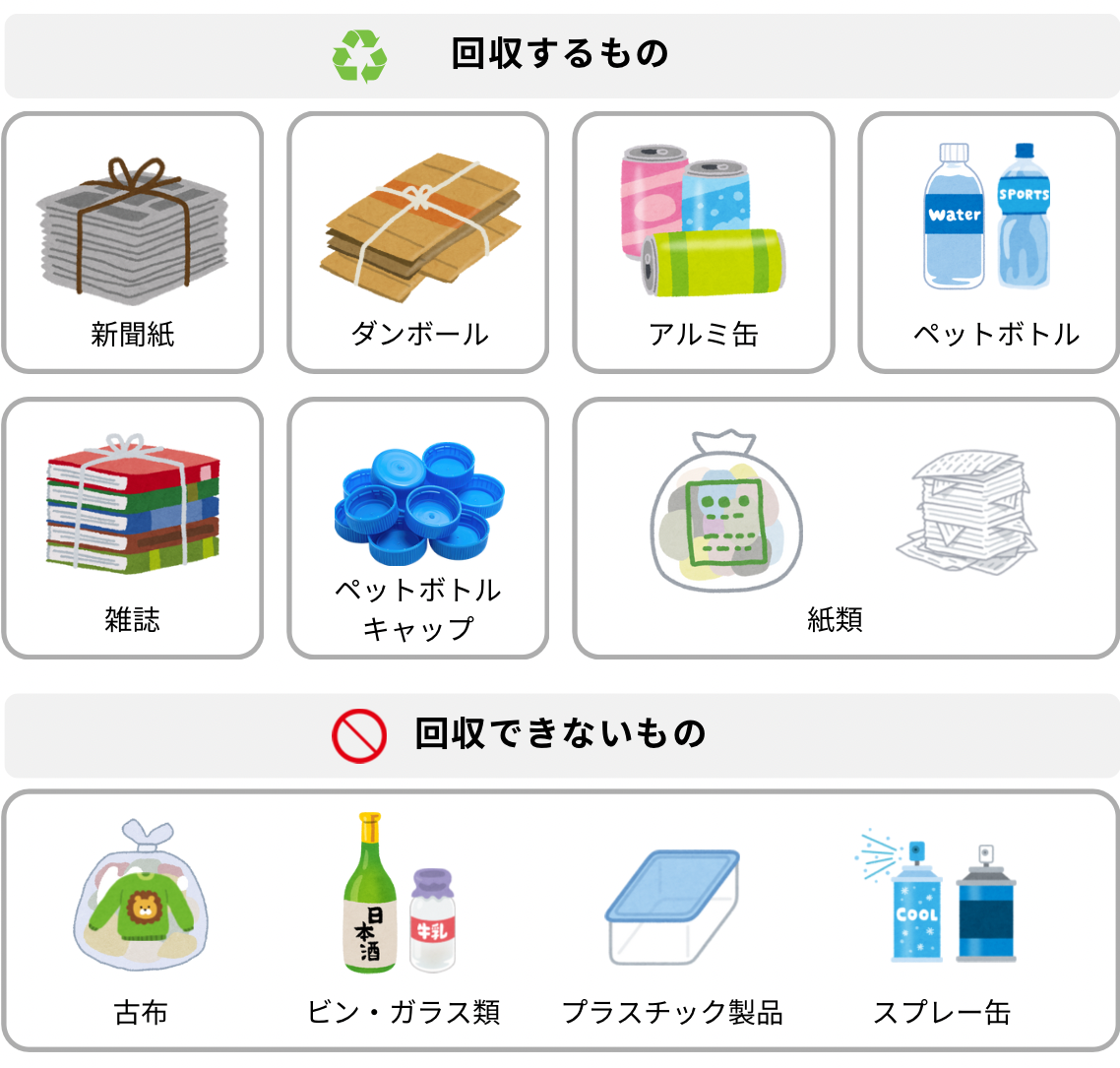☑ アルミ缶は潰して袋に入れて持ってきてください。